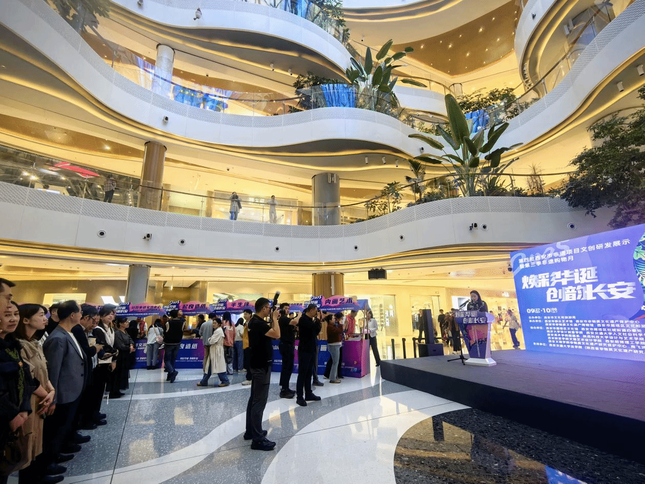 贺国庆、迎中秋之际。“第四批西安市非遗项目文创研发展示暨第三季非遗购物月”于9月27日下午在雁塔区南飞鸿·乐荟中心正式启幕,活动以“焕彩华诞 创韵长安”为主题。由西安市文化和旅游局主办,西安市非物质文化遗产保护中心等承办,西安市雁塔区文化馆、我校非物质文化遗产研究保护中心、南飞鸿乐荟中心等十多家单位协办。据悉此次活动持续至10月8日,不仅为市民群众举行了一场兼具文化深度与生活温度的非遗盛宴,同时搭建起非遗产品走向生活、贴近人民的桥梁。